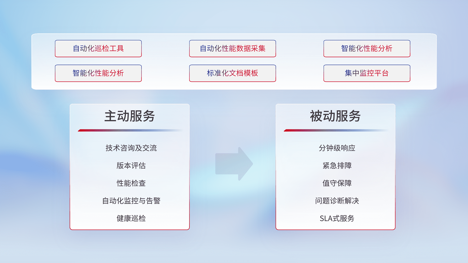 智能化工具和标准化文档,,,,保障服务质量,,,,提供主动服务(包含技术咨询、、版本评估、、性能检查、、、、自动化监控与告警、、、健康巡检)和被动服务包含(分钟级响应、、、、紧急排障、、值守保障、、、问题诊断解决、、SLA服务)。。
